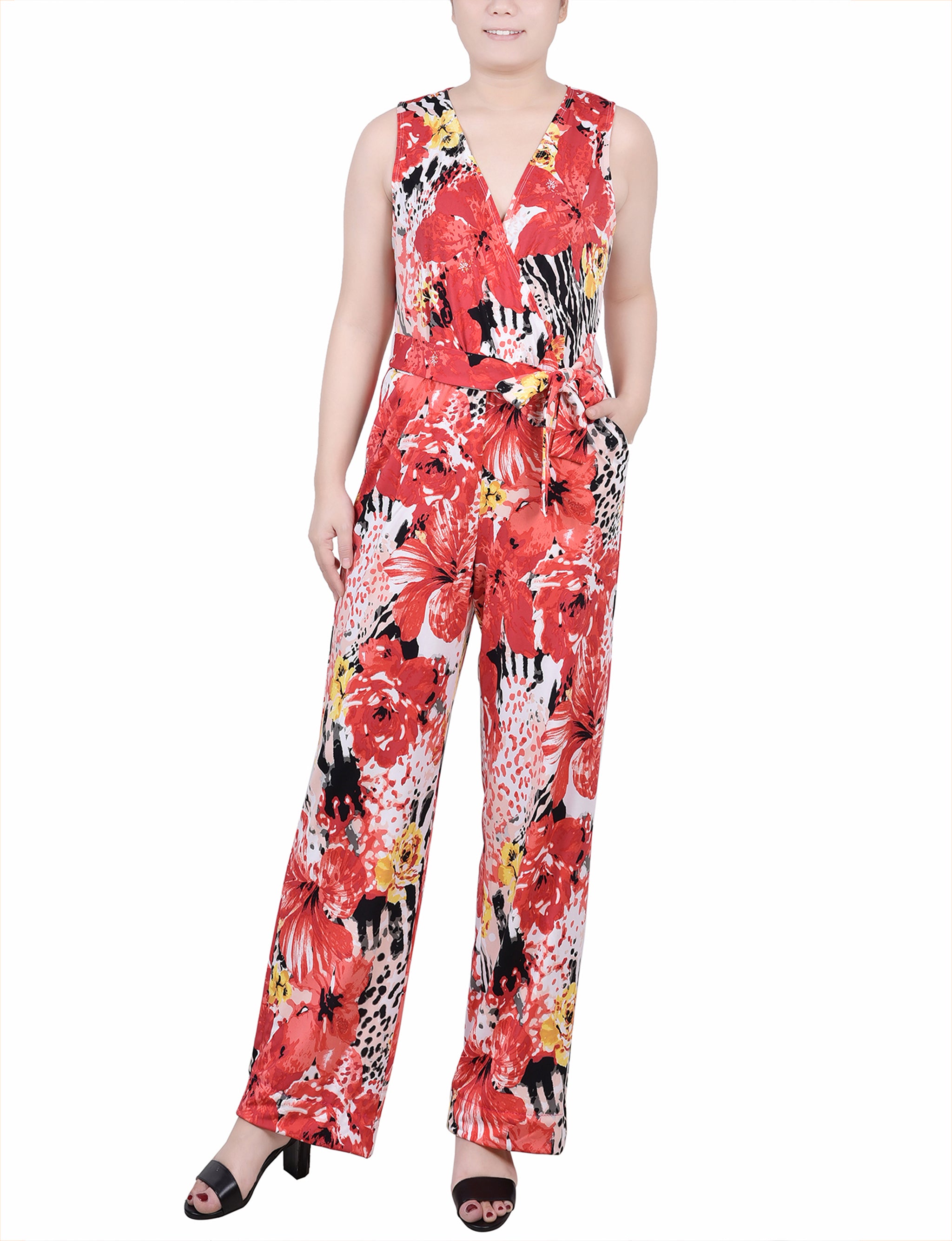 Tropical Sleeveless Belted Jumpsuit - Petite – Dressbarn