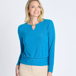 Brighten up your look with our Long Sleeve V-Neck Bar Trim Banded Top in Mykonos Blue. This vibrant top features a sleek bar detail at the neckline and a banded hem, offering both style and comfort in one effortlessly chic piece.