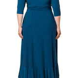 The Veronica Ruffled Evening Gown is an elegant long dress with a faux wrap design, slim 3/4 sleeves, a surplice neckline, and a ruched waistband. The gracefully sweeping skirt features ruffle details from the front waistband down through the hem to complete the look.