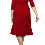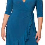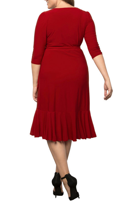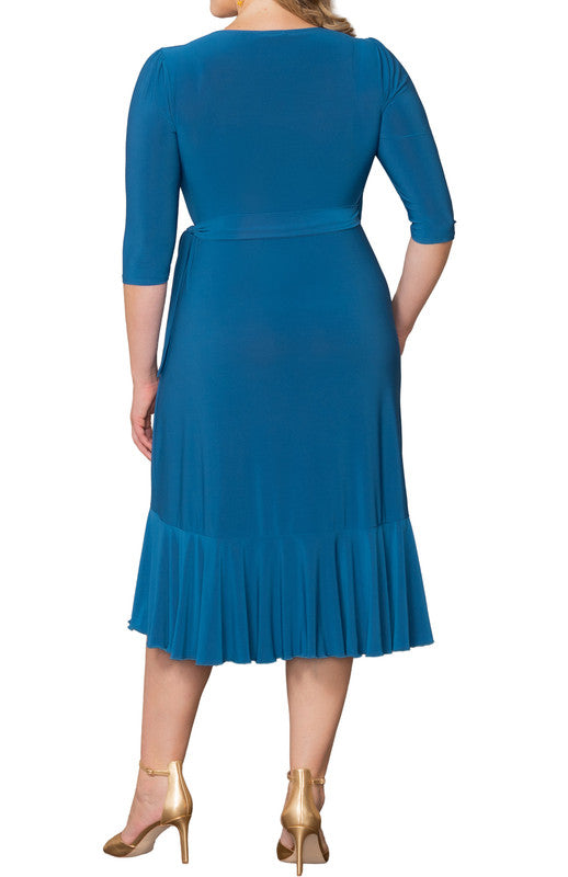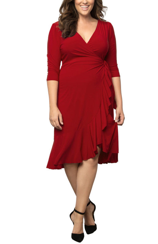 The Whimsy Ruffled Midi Wrap Dress features cascading flounces on the skirt and bottom hem. This functional wrap provides adjustable coverage and flattering 3/4 length sleeves. Perfect for cocktail and special occasions, work, and as a wedding guest dress. Available in both regular and plus sizes.