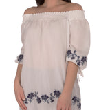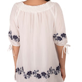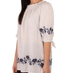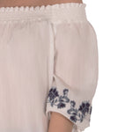 Beautiful floral embroidery really makes this blouse a must-have this season. Smocked neckline can be worn either on or off the shoulder.