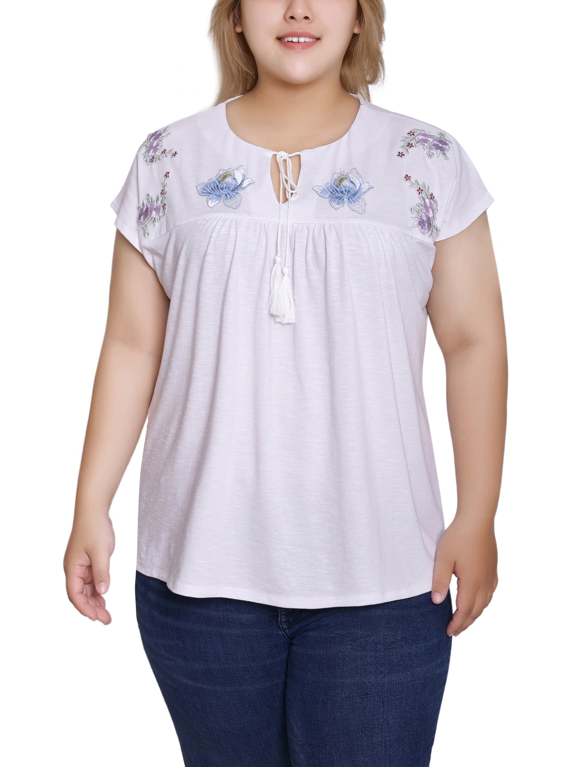 White Embroidered Yoke Extended Sleeve Top - Plus