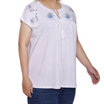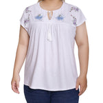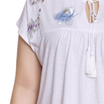 Soft, breezy, and beautifully detailed - this white cap-sleeve top features delicate floral embroidery and a tasseled tie neckline. Perfect for adding a touch of boho charm to your everyday style.