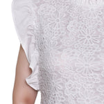 Add a touch of romance to your wardrobe with this white lace sleeveless top, featuring intricate floral embroidery and soft ruffle details on the shoulders. The high neckline with subtle pleating gives it a refined finish.