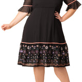 Step into effortless elegance with the Plus Size Mesmerizing Embroidered Cocktail Midi Dress. Designed to flatter your curves, this elegant plus size dress features a sophisticated boat neckline and 3/4 sleeves with flounce details. The embroidered flounce skirt adds graceful movement, while velvet trim on the sleeves and skirt brings a touch of luxe. A center back zipper ensures a seamless fit.