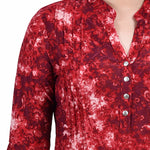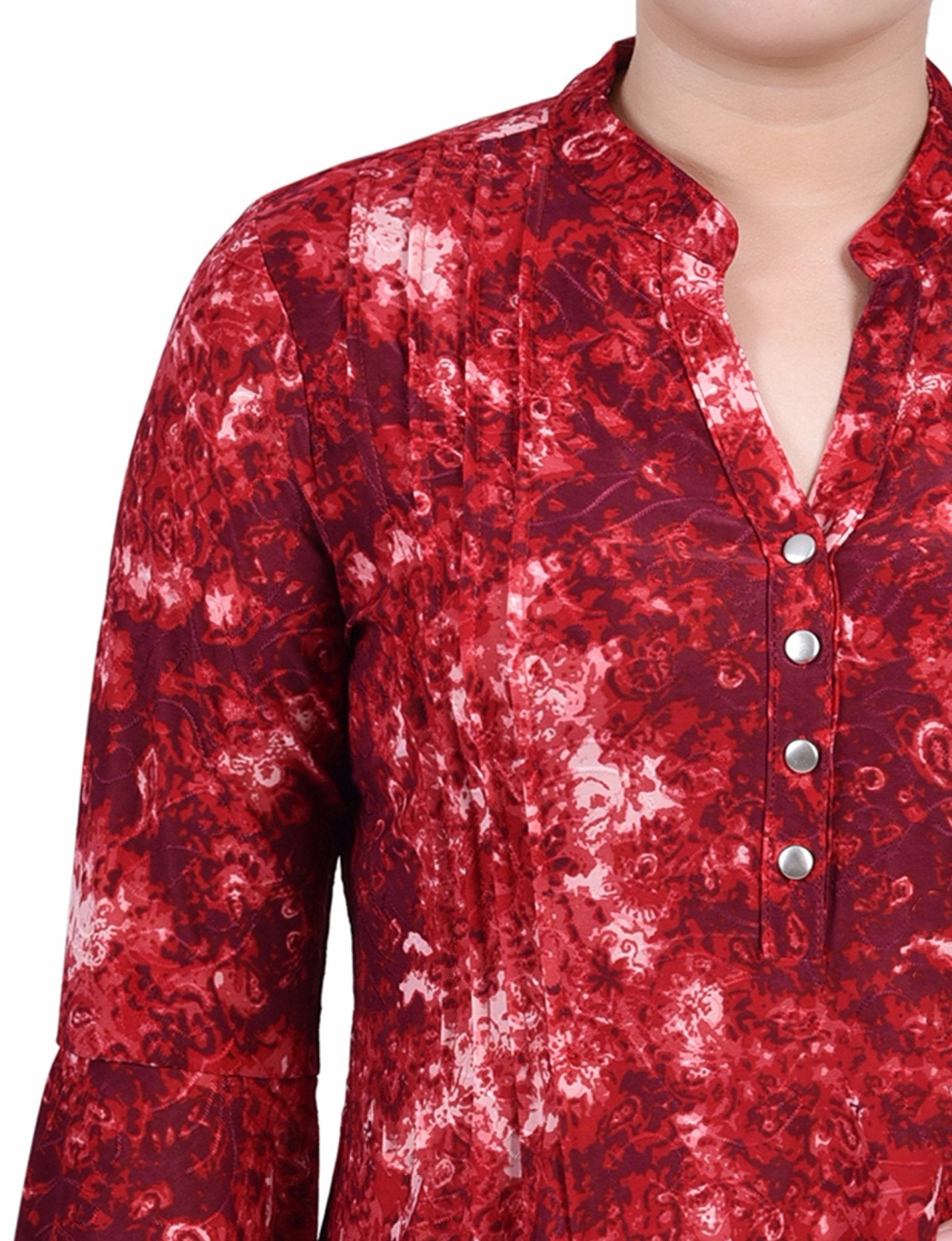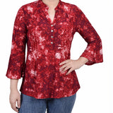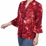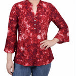 Wine Geobreeze 3/4 Bell Sleeve Pleat Front Y Neck Top - Petite – Dressbarn