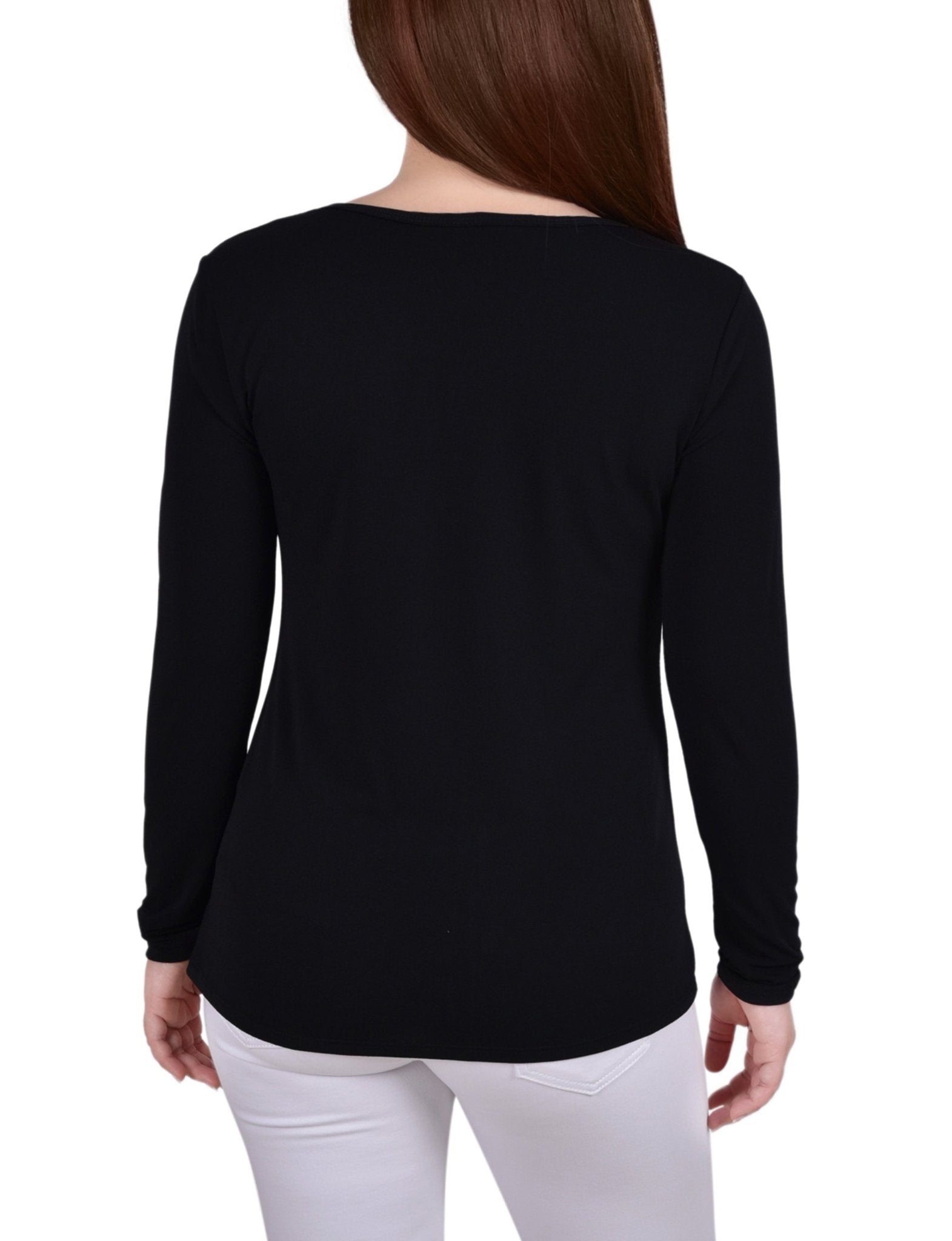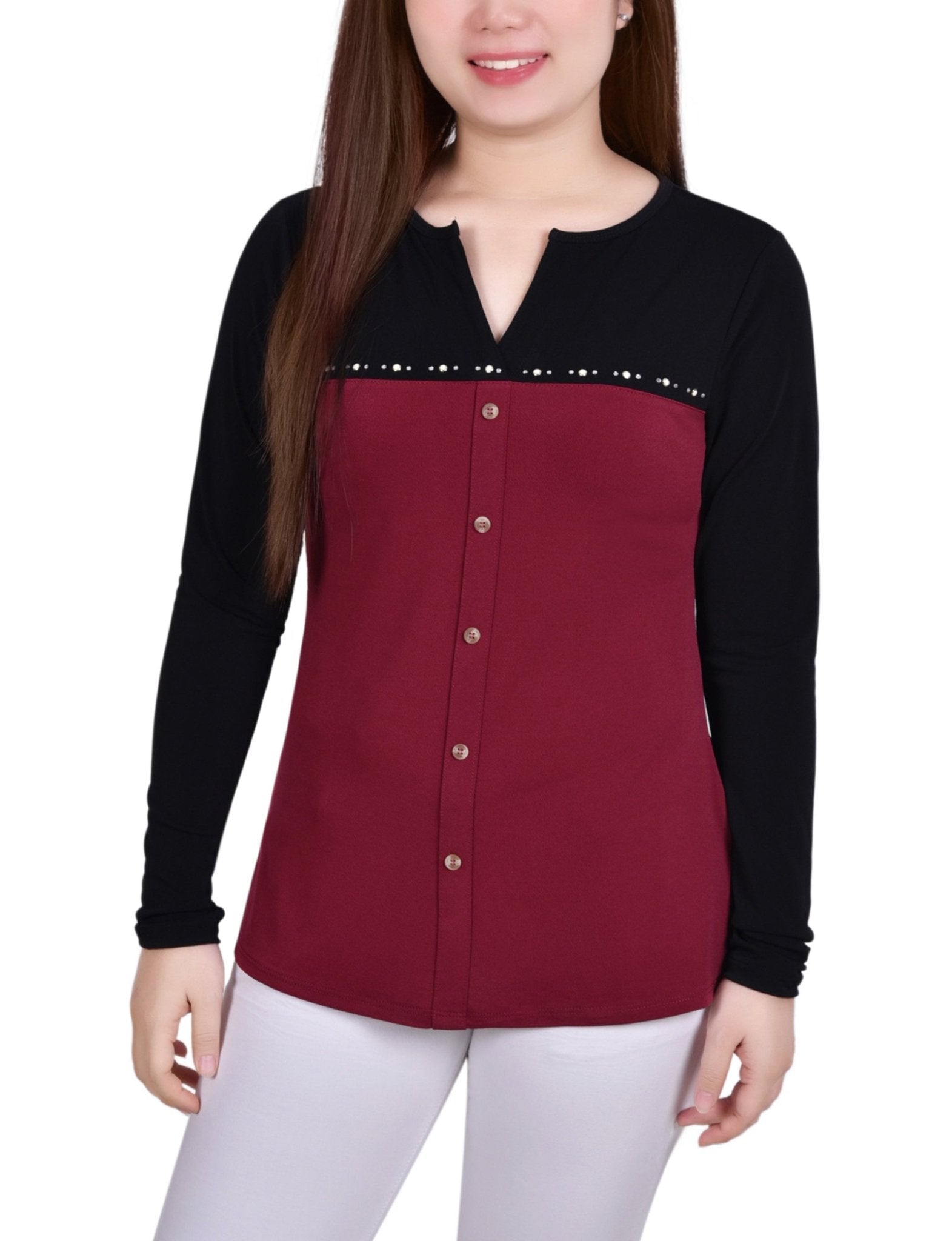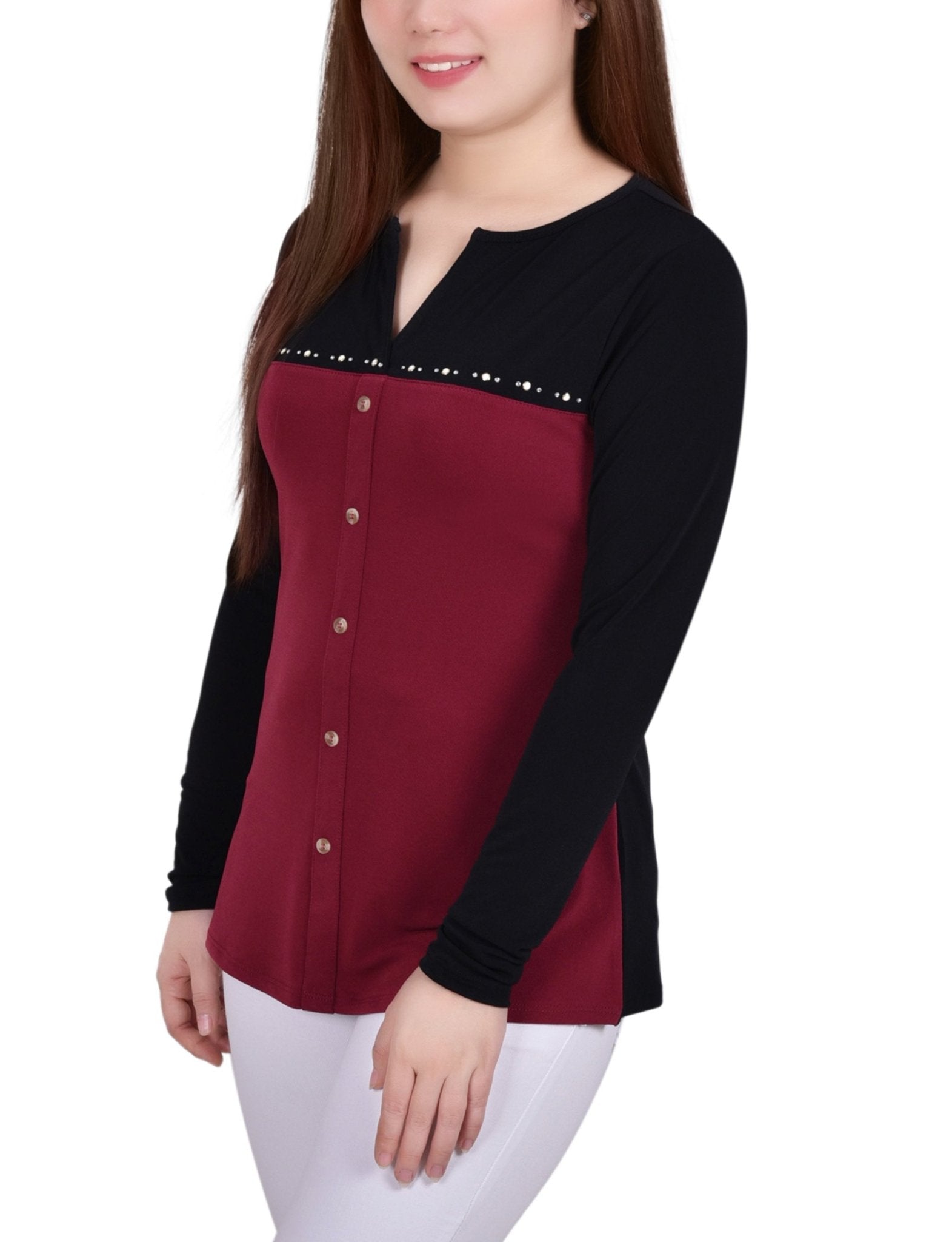 Dress it up or down, this studded neck knit crepe top can be paired with jeans or dressed up with your favorite dress pants or skirt.
