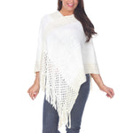Women's Cable Knit Poncho with Fringe Trim - White