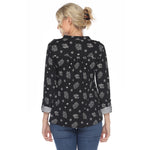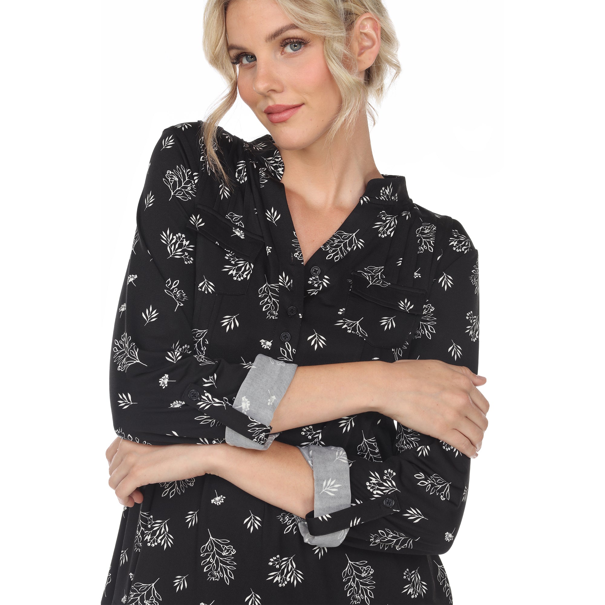 Indulge in this relaxed lightweight tunic top for a classic modern look. This long sleeve trendy floral print top features an open mandarin collar with a V-neck and button closure at chest, functional pockets at bust, pintuck pleats at front, yoke pleating back, and a rolled cuff with button tag closure. Flow free in this polyester and spandex blended garment with great stretch for unparalleled comfort.