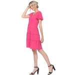 Our flouncy tiered design gives this midi dress a simple but elegant look. The easy, breezy style is what makes if a perfect casual wear on hot days. The loose fit will compliment and flatter all body types. It features a V-neckline, a faux button down front and flutter sleeves.