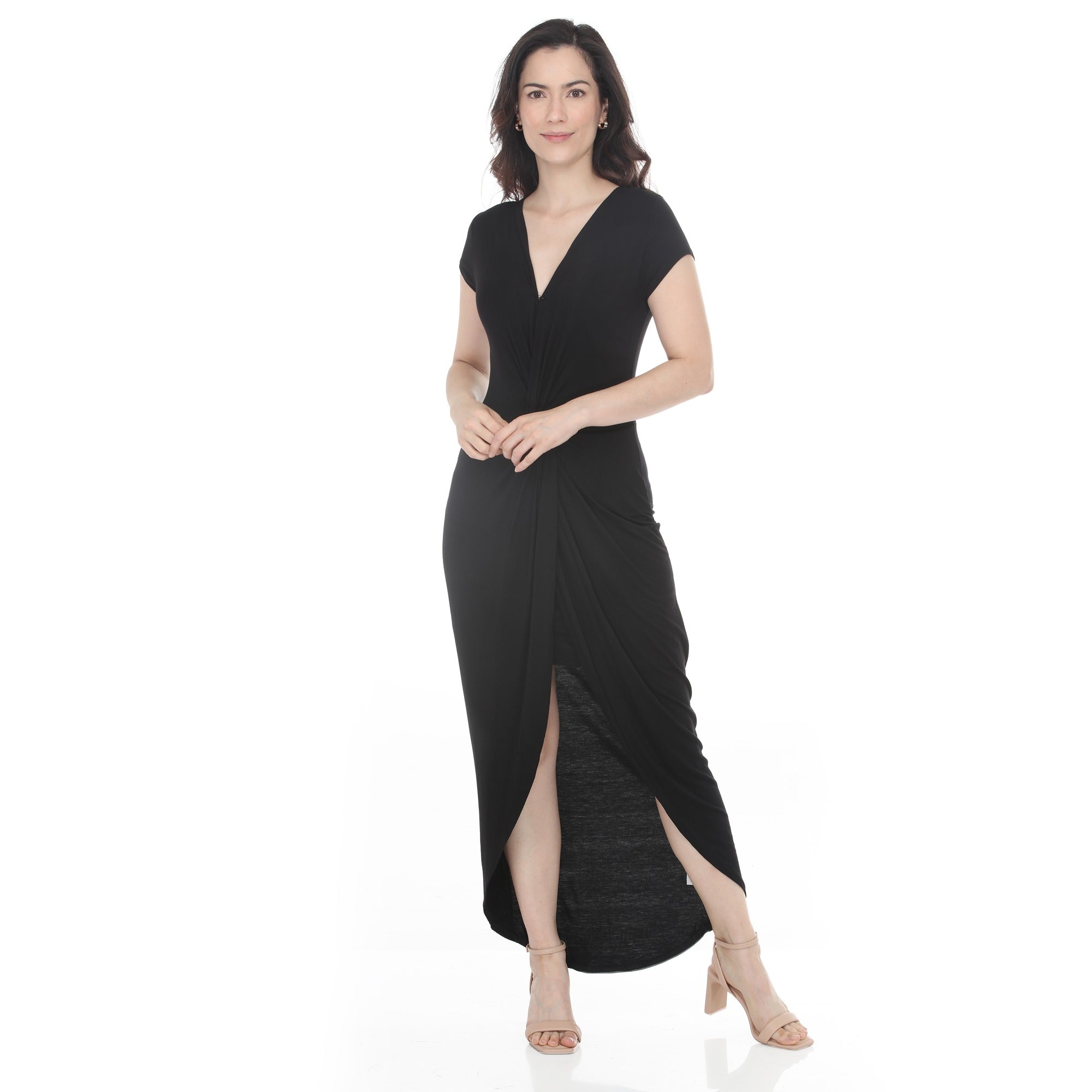 This V-neck maxi dress is designed to stand out with a sleek, flattering silhouette and modern detailing. The twist front design creates a naturally contoured shape that enhances the waist, while the high-low overlay adds movement and dimension for a more elevated look. Underneath, a built-in mini skirt provides added coverage and confidence, allowing for ease of movement without compromising style. The V-neckline elongates the neckline, and the short sleeves offer balanced coverage for a polished finish. Crafted from a soft stretch-knit fabric, this dress delivers both comfort and flexibility. Ideal for dinners, events, or nights out, it pairs effortlessly with heels and minimal accessories for a refined, occasion-ready look.