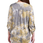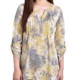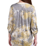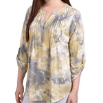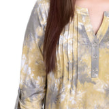 Yellow Tiedye 3/4 Bell Sleeve Pleat Front Y Neck Top