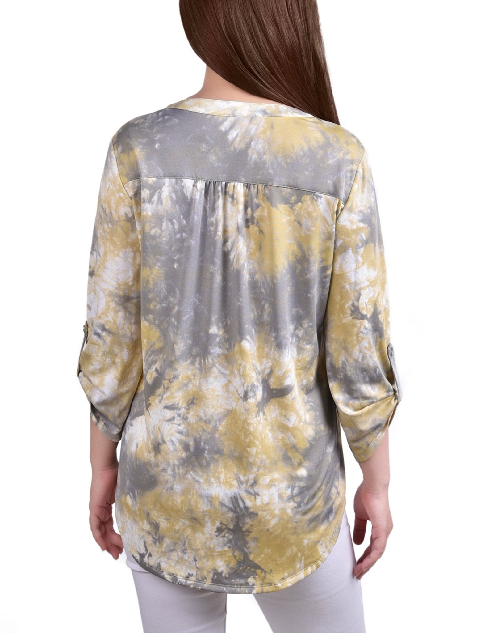 Yellow Tiedye 3/4 Bell Sleeve Pleat Front Y Neck Top – Dressbarn